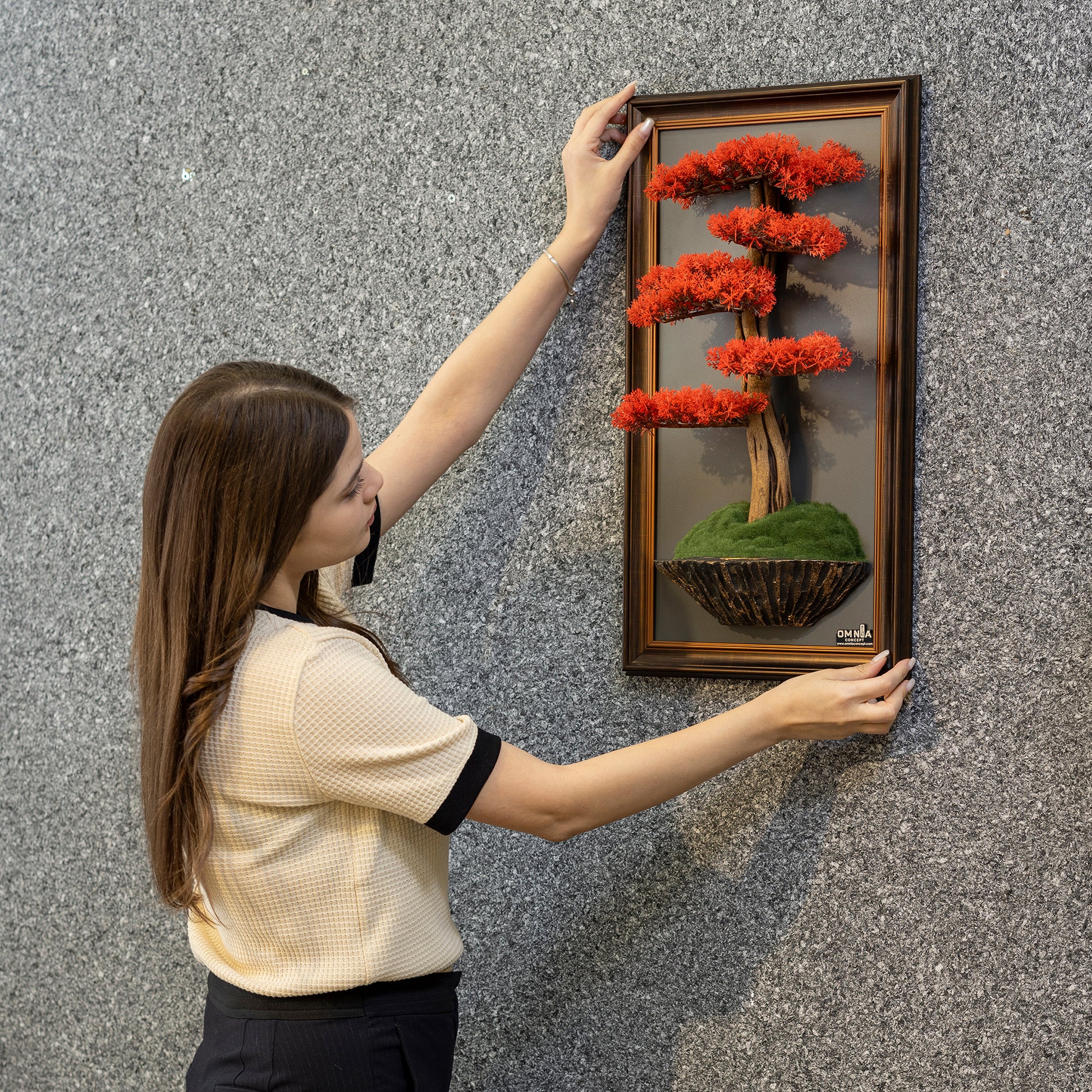 Unique Handmade Design: Each Bonsai Art Life Tree Tableau is meticulously crafted by hand, ensuring a one-of-a-kind piece of art that brings a touch of nature and tranquility to any space. The tree body features a rich brown color, adding to its natural appeal.